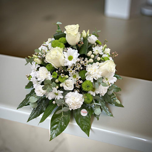 🌿 Centro mediano de flores naturales todas blancas y verdes variados.