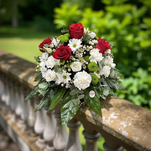 🌿 Centro mediano de flores naturales en tonos blancos y rojos y varios verdes variados.