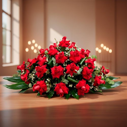 🌿 Centro de 25 rosas rojas naturales extras, Gipsophila Peniculata y verdes variados
