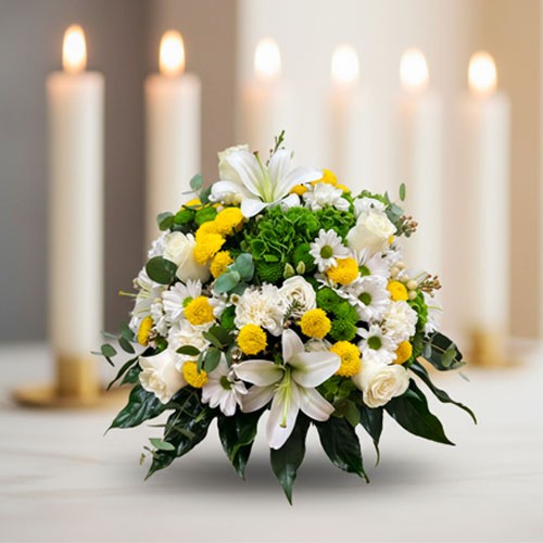 🌿 Centro mediano de flores naturales en tonos blancos y amarillos y varios verdes variados.