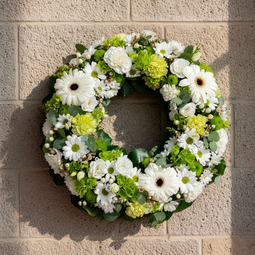 🌿 Corona de 60cm de diámetro con flores naturales todas de color blanco y verdes variados.