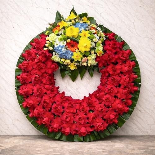🌿 Corona grande de 1 cabecera de flor variada y rosas naturales extras con tubos con agua para su mayor duración y verdes variados.